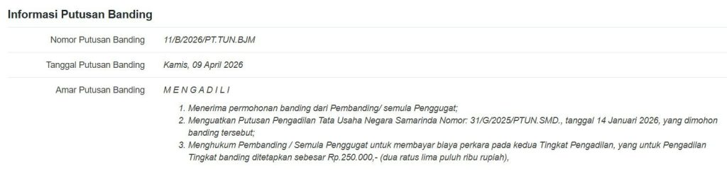 Samarinda — Pengadilan Tata Usaha Negara (PTUN) Banjarmasin secara resmi menolak banding yang diajukan oleh Yayasan Melati. Informasi putusan tersebut menyatakan bahwa PTUN Banjarmasin menguatkan putusan PTUN Samarinda, sehingga keputusan sebelumnya tetap berlaku. Dengan dikeluarkannya putusan tersebut, kedudukan hukum atas kepemilikan tanah dan bangunan yang berlokasi di Samarinda Seberang semakin kuat dan memiliki kepastian hukum.