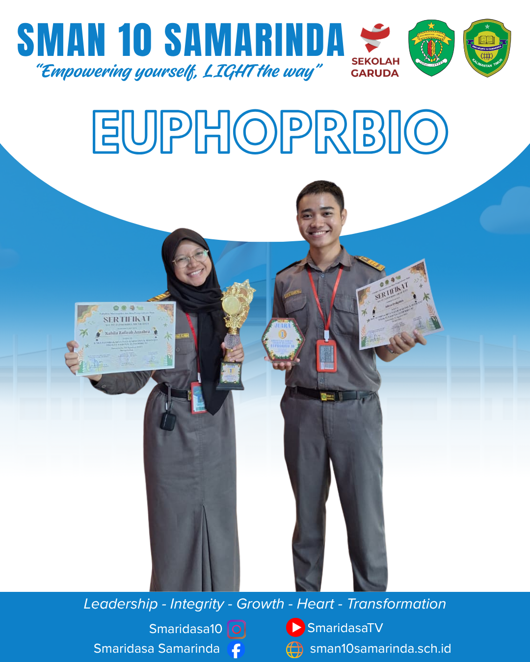 Samarinda, 12 Mei 2025– Kabar membanggakan datang dari SMAN 10 Samarinda. Tim yang terdiri dari dua siswa berbakat, Nabilah Zafirah Azzahra dan Aditya Syahputra, berhasil meraih Juara 1 pada lomba Karya Tulis Ilmiah dalam ajang EUPHORBIO’9 yang diadakan oleh Fakultas Matematika dan Ilmu Pengetahuan Alam (FMIPA) Universitas Mulawarman. Event rutin ini diikuti oleh peserta terbaik dari setiap provinsi di Indonesia dan menjadi salah satu ajang bergengsi bagi siswa SMA di tanah air.